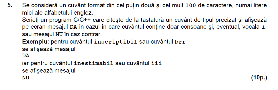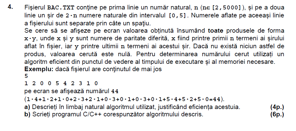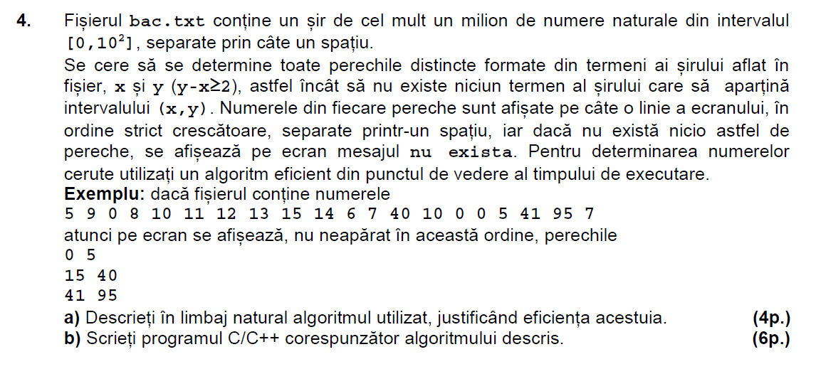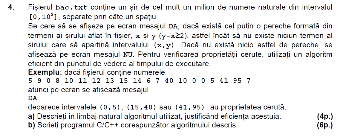 Mai jos puteti gasi enuntul si rezolvarea problemei 4 de la subiectul al III-lea de la examenul de bacalaureat la informatica (stiinte ale naturii) din august-septembrie 2015.